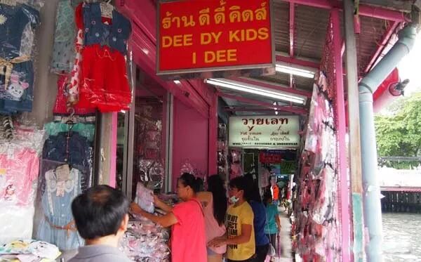 快船到(W3.)Talad Bobae 碼頭,下船處的岸邊滿是衣服攤販,眼前的大樓就是Bobae Tower 寶馬成衣中心,路旁也滿是攤販,可以看到當地人一袋一袋批貨、嘟嘟車載貨的情景。