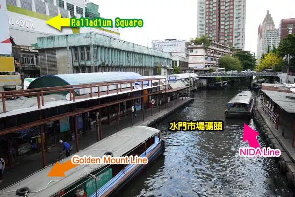 搭BTS 捷運到Chit Lom 奇隆站1 號出口方向,經過Big C 量販店繼續直走到小橋,Pratu Nam Pier 帕都南碼頭就在橋下。「帕都南」在當地就是水門市場區的意思,橋的左前方就是水門Platinum Fashion mall 白金時尚購物大樓。Golden Mount Line 方向,上船前先向船夫確認往「Bobae Tower 」。