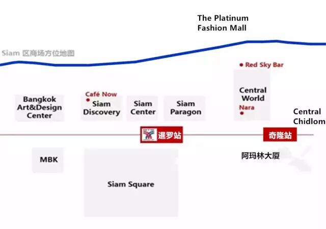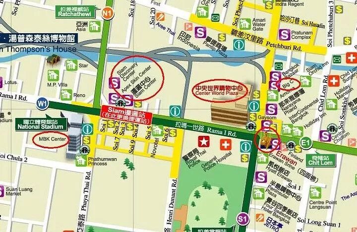 Siam商圈東起四面佛,西至MBK商場,北至水門市場,南至朱拉隆功大學。下圖是以BTS為起點,做的簡易地圖,方便大家直觀了解各商場方位。