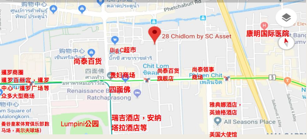 所以,暹羅商圈絕對是曼谷的最強商圈,這裡擁有現代都市生活的一切,必然也成為最具競爭力的黃金地段。今天小編要推薦的就是位於BTS Chidlom站附近的高層豪宅,而下面這張地圖足以說明它的“豪”氣!